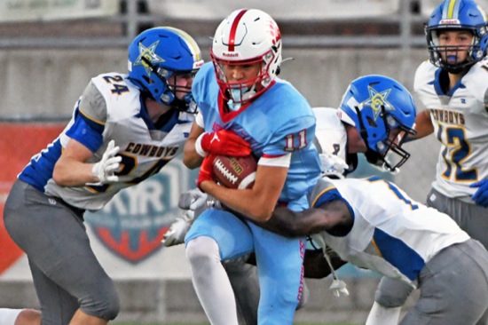Ashland's Cole Iwamoto (11) tries to break free from Crook County tacklers while returning a kickoff after the Cowboys' second touchdown of the game in the first quarter at Walter A. Phillips Field in Ashland on Friday, March 12.