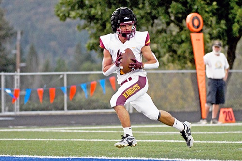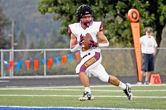 North Valley's Hayden Taylor pulls in a pass on a 33-yard play for a touchdown on fourth and 27 against Hidden Valley in the first quarter in Murphy on Friday night, Sept. 19.
