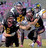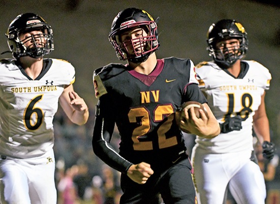 North Valley running back Gabe Dahlberg (22) outraces South Umpqua's Mason Johnson (6) and Rudolphe Vasquez (18) to the end zone in the third quarter to score the two teams' only touchdown of the game on Friday night in Merlin. North Valley won 6-3.