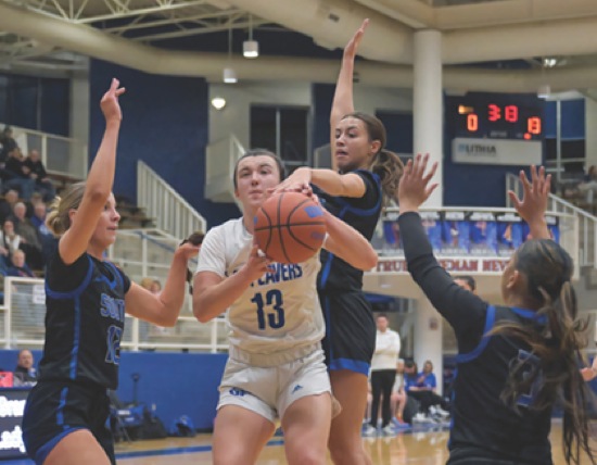 All night long South Medford was all over GP...tying them up. (L to R) SM #12, GP #13, SM #11, SM #3 South Medford wins over Grants Pass, 76-33 Photos By: Joel Takarsh