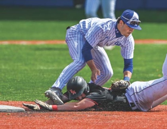 (2nd inning) NM #13 can't get his hands back to the bag (2nd base) and GP #9 puts the tag on him - OUT!