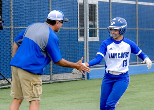 Photo by JOEL TAKARSH/for The Daily Courier, PIC #0923 (3rd inning) GP #13 is congratulated by her coach as she rounds 3rd base after her solo home run. Lady Cavers win big...20-2!