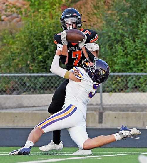 Crater's Will Maddox (7) hauls in a long pass in front of Marshfield's Junior Whitmer during the first quarter of the Comets' season opener against the Pirates on Friday, Aug. 29, in Central Point.