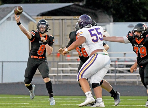 Crater quarterback Cohen Sprague (8) lets a pass fly during the second quarter of the Comets' season opener against the Pirates on Friday, Aug. 29, in Central Point.