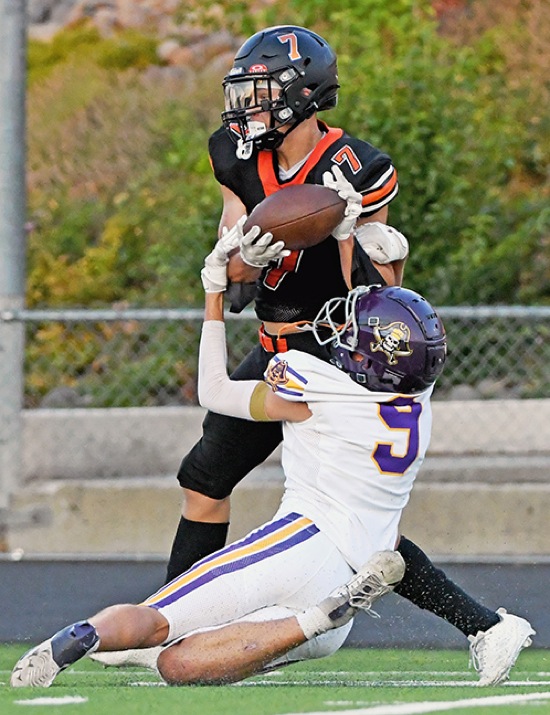 Crater's Will Maddox (7) hauls in a long pass in front of Marshfield's Junior Whitmer (9) during the first quarter of the Comets' season opener against the Pirates on Friday, Aug. 29, in Central Point.