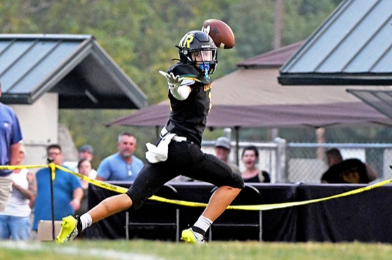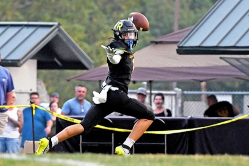 Rogue River's Mason Scott races for a touchdown on the Chieftains' first possession of the game against Monroe on Friday night. Sept. 5, at Chieftain Stadium.