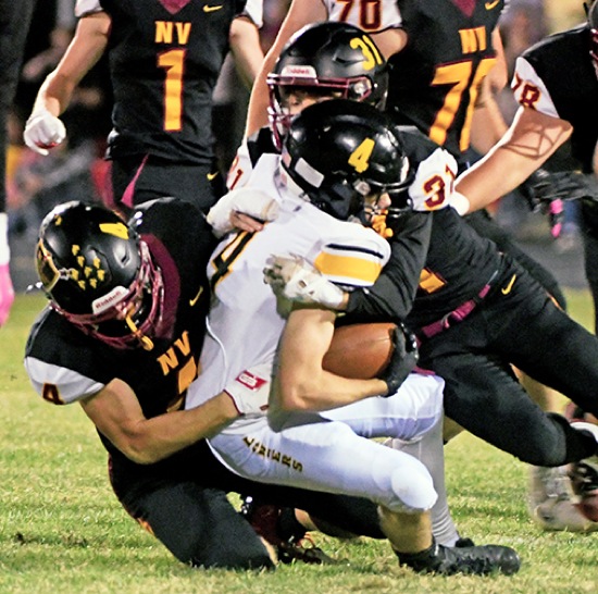 North Valley linebacker Caleb Garland (left) and defensive back Wyatt Bell (31) haul down South Umpqua receiver Josiah Garrison (center) during the second half on Friday night in Merlin. The Knights won 6-3.