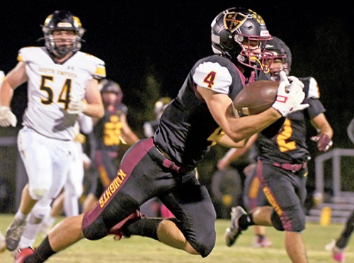 North Valley tight end Caleb Garland makes a diving catch in the second quarter against South Umpqua on Friday night in Merlin. North Valley defeated South Umpqua 6-3.