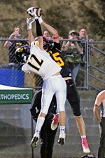 North Valley's Hayden Taylor (2) stretches toward the end zone but misses breaking the plane of the goal line by 1 yard on fourth-and-goal as the Knights come up just short on a scoring drive in the first quarter against South Umpqua on Friday night in Merlin. North Valley won the game 6-3.