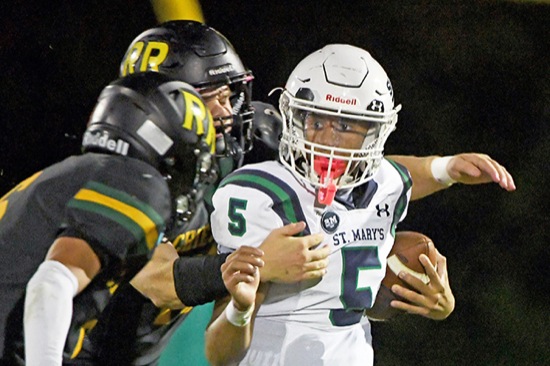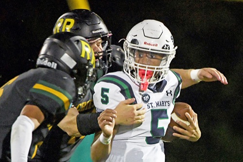 Rogue River defenders swarm St. Mary's quarterback Mason James (5) during the first quarter on Friday night at Chieftain Stadium. The Chieftains defeated the Crusaders 65-42.
