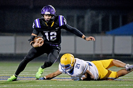 Cascade Christian quarterback Deryk Farmer (12) scampers away from Gervais linebacker Johnny Mariano to pick up yardage during the second quarter of their Class 3A state semifinal game Saturday at Cottage Grove High School. Farmer was the top-ranked Challengers' leading rusher against the Cougars, gaining 93 yards on 10 carries. Cascade Christian defeated Gervais 36-0.