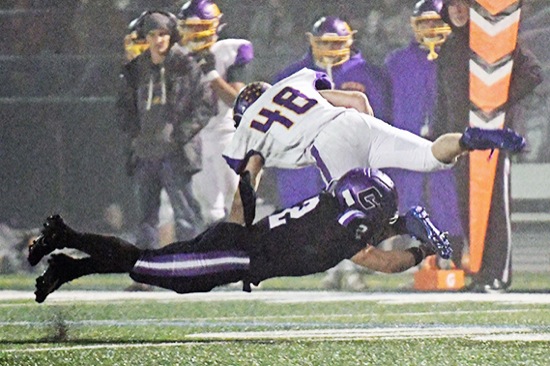 Cascade Christian's Bryson Walker takes down Burns running back Tommy Winn during the Class 3A football state championship game Saturday night at Summit High School in Bend. Walker led the Challenger defense with eight tackles while also rushing for 50 yards and a key touchdown on offense. The Challengers defeated the Hilanders 35-28.