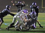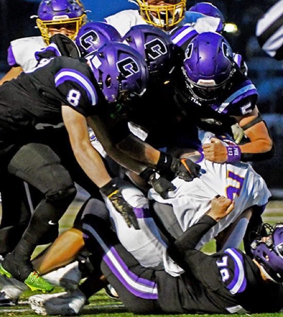 Cascade Christian's defense swarms Burns quarterback Jack Wright during the Class 3A football state championship game Saturday night at Summit High School in Bend.