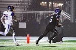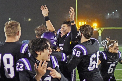 Cascade Christian quarterback Deryk Farmer (center) celebrates with teammates after the Challengers defeated Burns 35-28 to win the Class 3A football state championship game Saturday night at Summit High School in Bend.