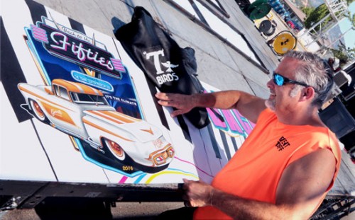 Jeff Voigt, Back to the Fifties director for 12 years, spreads out a banner displaying the new logo design for this year at the performance area at the parking lot at Sixth and G Streets. Today, there will be a Classic Car Lineup on G Street from 5:30 to 10 p.m. with the street being closed-off beginning at 4 p.m. The band, Rogue Rebellion will perorm a free concert in the parking lot at 7 p.m and the movie, Top Gun, will be shown at 9:15 p.m. The event continues Saturday with the Classic Car Show-n-Shine at Riverside Park from 10 a.m. to 3 p.m. Sixth and Seventh Streets will be the scene for the Classic Car Cruise with hundreds of automobiles and trucks driving through town from 7 to 9 p.m. The grand finale starts at 9:15 p.m. at the Town Center Plaza parking lot, with Jerry Lee Lewis and Elvis tribute performers.